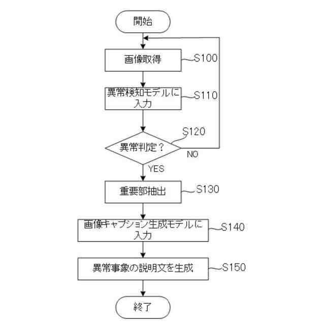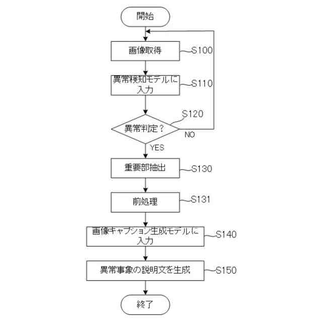 【解決手段】システムは、画像として捉えられた事象が異常であるか否かを判定する訓練がされた異常検知モデルと、入力された入力画像における事象が異常であると異常判定された場合、入力画像の各画素が異常判定に与える寄与度に基づいて、入力画像から重要部情報を抽出する重要度抽出部と、抽出された重要部情報に基づいて、異常判定された事象をキャプションとして生成する画像キャプション生成モデルと、を備える。