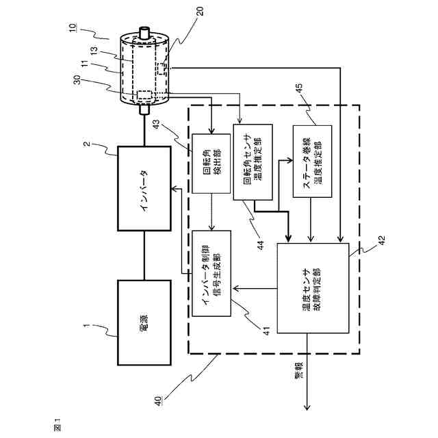 そこで、ステータ巻線温度センサと別の、ステータ巻線温度を推定する手段を追加し、ステータ巻線温度センサの検出値と推定値を比較することでステータ巻線温度センサの異常を判定する手法がある。ステータ巻線温度を推定する手段として、モータ回転数を検出する回転角センサの温度特性を利用してステータ巻線温度を推定する手法が知られている。