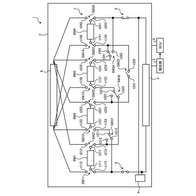 図1は、実施形態1に係る電力制御装置を含む車両の概略的な構成を表す図である。車両1は、電気回路2と、検出部3と、BCU(Battery Control Unit)4と、走行用モータ5と、補機6と、バッテリモジュールBM1~BM4と、を備える。電気回路2は、切替部7と、リレー8と、DCDCコンバータ9と、を備える。