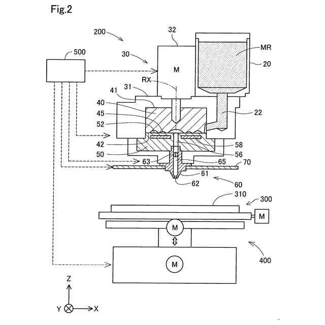 図1は、第1実施形態における三次元造形物の製造システム100の概略構成を示す説明図である。図1には、互いに直交するX,Y,Z方向を示す矢印が示されている。X方向及びY方向は、水平面に平行な方向であり、Z方向は、重力方向とは反対の方向である。X,Y,Z方向を示す矢印は、他の図においても、図示の方向が図1と対応するように適宜、図示してある。以下の説明において、向きを特定する場合には、矢印の指し示す方向である正の方向を「+」、矢印の指し示す方向とは反対の方向である負の方向を「-」として、方向表記に正負の符合を併用する。