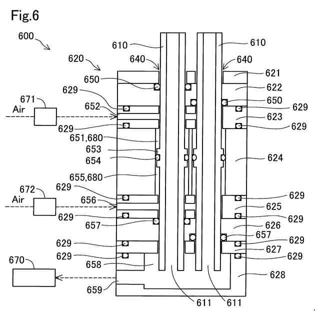 前記複数のシャフトの各々は、前記第1加圧室又は前記第2加圧室内の圧力が調整されることで前記フランジ部が前記加圧室内で移動することによって前記シャフトの延びる方向に沿って移動し、