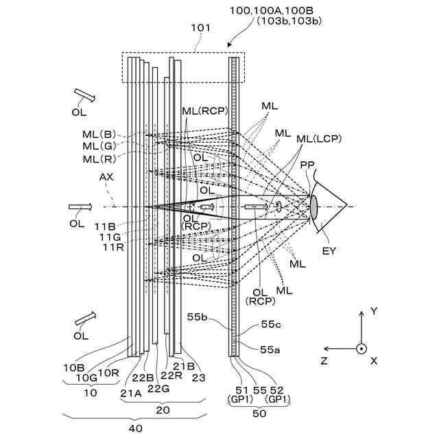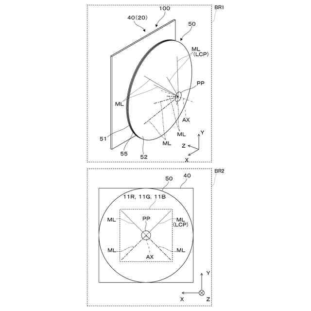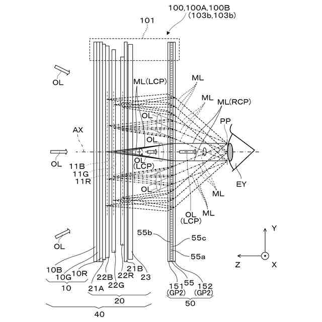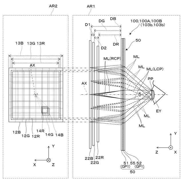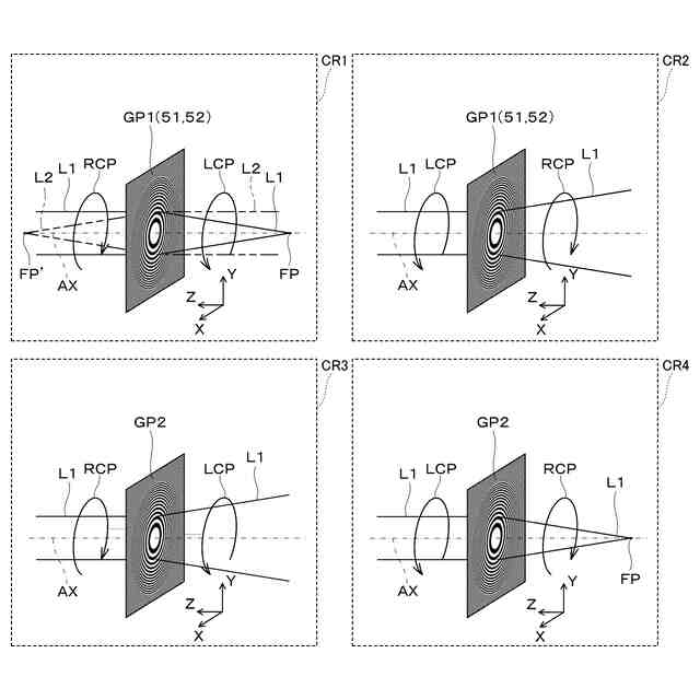 比較的重たい厚肉レンズの代わりに、比較的薄くて軽い偏光回折レンズを使用することが期待されている。しかし、偏光回折レンズは色収差の補正が難しい。