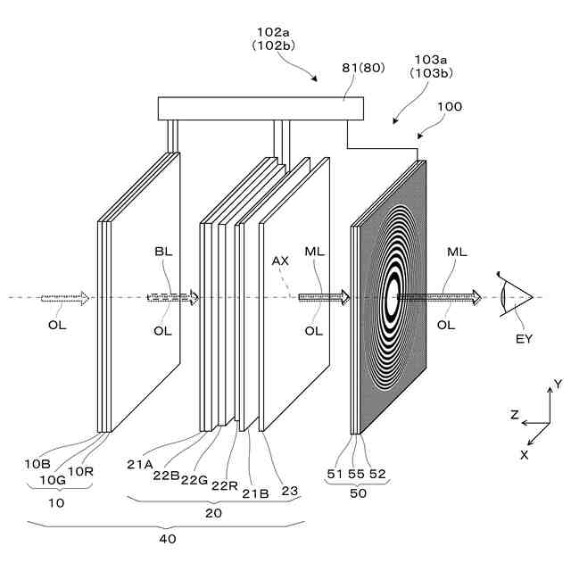 前記第1寸法と前記第2寸法との差は、前記第1画素および前記第2画素の前記第1偏光回折レンズまでの距離における差を相殺し、互いに対応する前記第1画素及び前記第2画素は、所望の観測位置において見かけ上重なり合う形状を有する、