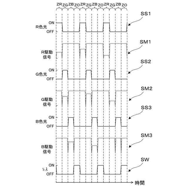 前記第1偏光回折レンズ及び前記第2偏光回折レンズの間に配置され、前記第1状態、前記第2状態及び前記第3状態において円偏光を有する光の偏光回転方向を逆にする1/2波長板として動作し、前記第4状態において光を透過させるスイッチング1/2波長板