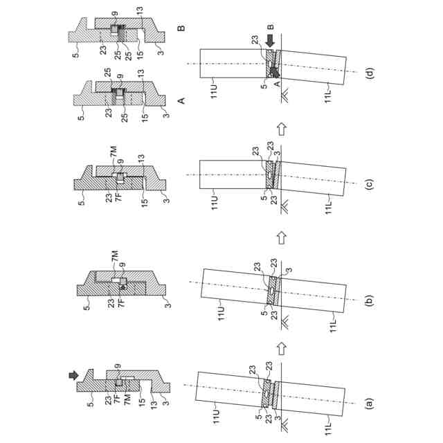 (1)本発明に係る機械式継手は、管状のPIN継手と、該PIN継手が挿入されるBOX継手と、前記PIN継手の外周面と前記BOX継手の内周面のそれぞれに対向するように形成された一段以上の環状溝と、前記BOX継手又は前記PIN継手の前記環状溝に前記PIN継手の前記BOX継手への挿入を妨げないように格納可能、かつ前記挿入状態において前記環状溝内で前記BOX継手側と前記PIN継手側に跨るように配置可能なC型リング部材と、を備え、鋼管端部に取り付けられて鋼管同士を接合する機械式継手であって、