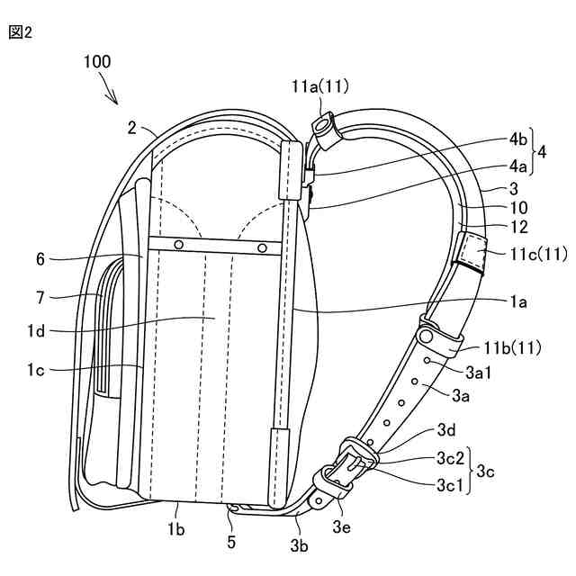実施の形態における背負い鞄100は、ランドセル、リュックサックなどの各種の背負い鞄に適用可能である。実施の形態では、背負い鞄100は一例としてのランドセルである。