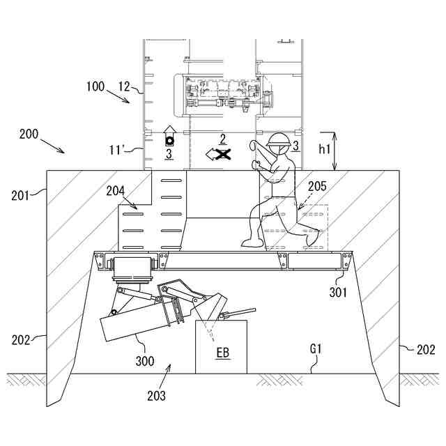 特許文献1に記載の艤装設備は、横断面積の小さいケーソンの作業室内でも機械掘削を可能としている。しかし、特許文献1に記載の艤装設備は、図1等に示すように、狭い作業室内の天上面に設置された円形のレール上をケーソンショベルが移動して掘削する関係上、ケーソンショベルを直接操作する場合の人員が昇降するシャフト孔が、ケーソンショベルの故障で塞がれてしまい、脱出不能になり得るおそれがあるという問題があった。