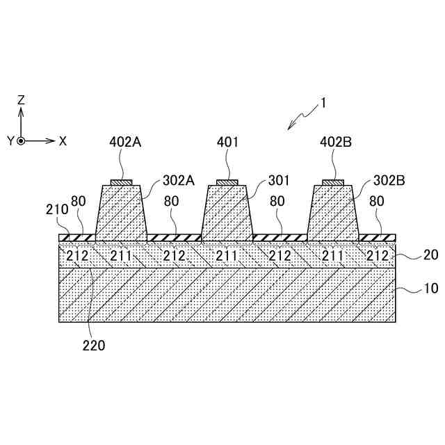 第1の実施形態に係る縦型ホール素子1は、図1に示すように、第1面210と第1面210の反対方向を向く第2面220を有する導電性の第1半導体層20と、第1面210の上方に配置された第1感磁層301および第2感磁層302A、302Bを備える。以下において、第2感磁層302Aと第2感磁層302Bのそれぞれを限定しない場合は「第2感磁層302」と表記する。第2感磁層302は、第1感磁層301から離隔した位置で第1面210の上方に配置されている。また、第1感磁層301と第2感磁層302のそれぞれを限定しない場合は、「感磁層30」と表記する。感磁層30と第1半導体層20は電気的に接続されている。