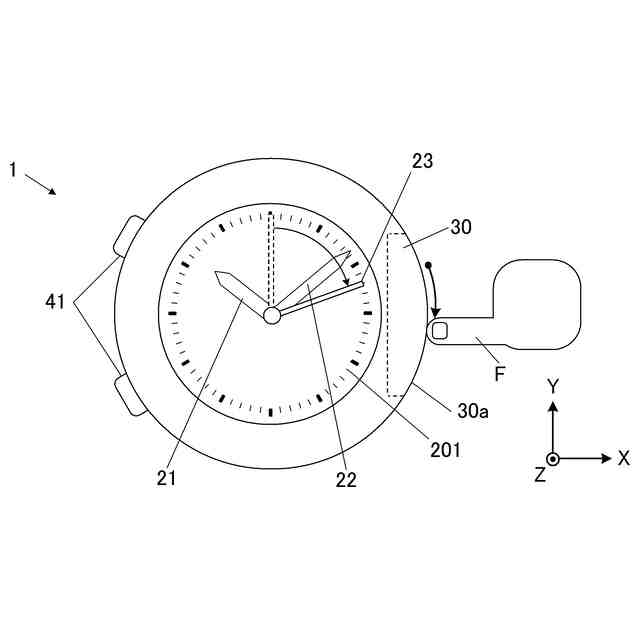 以下、本発明の実施の形態を図面に基づいて説明する。図1に示すように、電子時計1(電子機器)は、表示部20及び図示略の回路基板等が内部に格納された筐体101と、筐体101に取り付けられた2本のバンド102とを備える。電子時計1は、バンド102を手首に巻き回すことでユーザの手首に装着されて用いられる腕時計である。以下では、表示部20の文字板に平行かつ表示部20の文字板の中央から3時方向に向かう方向を+X方向とし、文字板に平行かつ文字板の中央から12時方向に向かう方向を+Y方向とし、文字板の法線方向を+Z方向とする。筐体101は、+Z方向から見て略円形である。筐体101の+X方向側(概ね文字板の2時方向から4時方向の間)の側面には、ユーザの指等の操作手段によるタッチ操作を検出可能なタッチ操作部30(タッチパネル)が設けられている。図2に示すように、タッチ操作部30は、+X方向から見てY方向に延びる曲面状の操作面30aを有する。筐体101の-X方向側の側面には、押下操作が可能な操作ボタン41が設けられている。