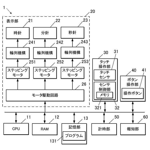 図3に示すように、電子時計1は、CPU11(Central Processing Unit)(制御部、制御手段)と、RAM12(Random Access Memory)と、記憶部13と、表示部20と、タッチ操作部30と、ボタン操作部40と、計時部50と、報知部60と、を備える。電子時計1の各部は、バス等のデータ伝送経路を介して接続されている。