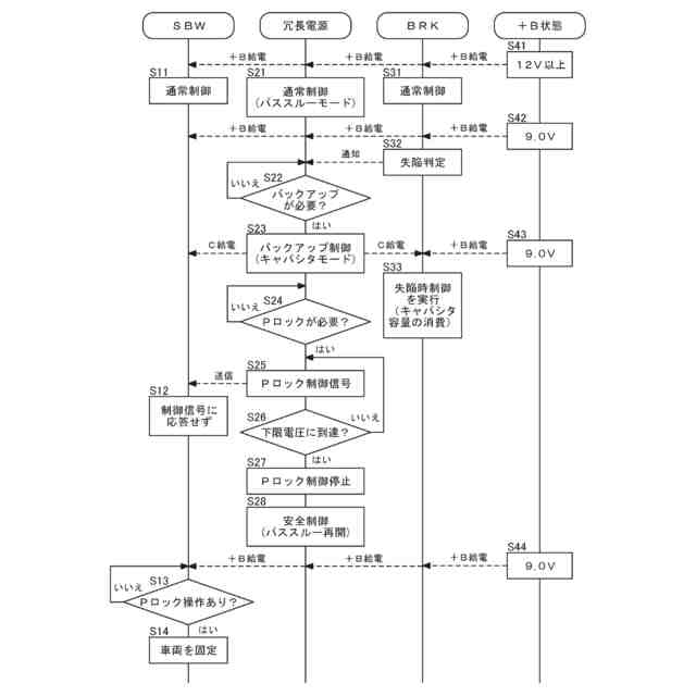 メイン電源の失陥時における冗長電源システム、シフトバイワイヤ、およびブレーキの動きを説明する応用例の動作シーケンス