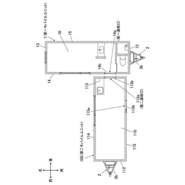 請求項1に記載の発明は、例えば図1~図12に示すように、複数のモバイルユニット1,100が、互いの連絡口14a,113aが対向した状態で隣り合って配置され、