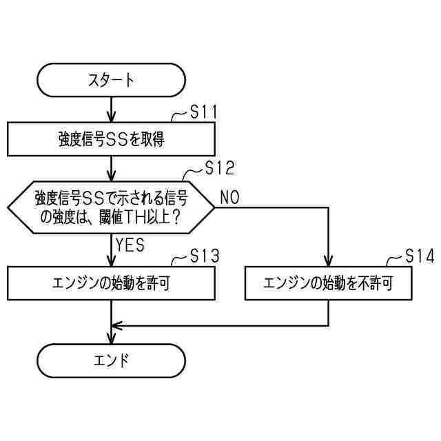 図1に示すように、車両10は、エンジン20と、スイッチ30と、アンテナ40と、制御装置50と、を備えている。エンジン20は、車両10を駆動させる駆動装置である。スイッチ30は、ユーザに操作されることにより、エンジン20の始動要求SDを示す信号を制御装置50へ出力する。
