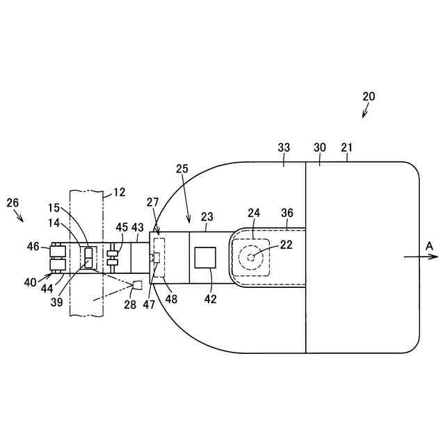 図1に無人搬送車が牽引対象とする牽引物10の一例を示す。牽引物10は、床面等の走行面上を走行可能とする例えば台車であり、詳しくはカートラックを例に説明する。牽引物10は、長尺状の荷台部11と、この荷台部11の下面側で長手方向の両端および中央の各位置に配設された複数の枠部12と、これら枠部12の下面側に配設された複数の車輪13とを備えている。牽引物10は、荷台部11の長手方向(前後方向)の一方または他方に向けた方向に走行可能とする。