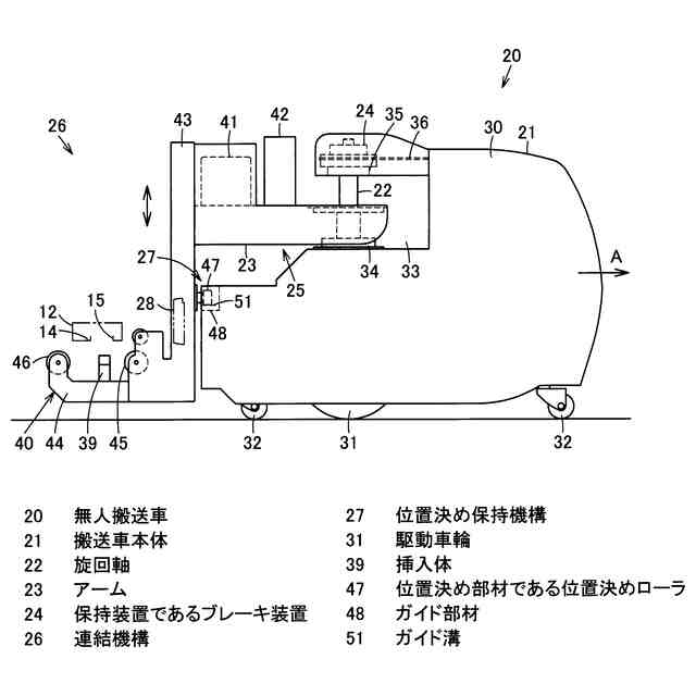 【解決手段】牽引物を牽引する無人搬送車20である。無人搬送車20は、搬送車本体21と、旋回軸22と、アーム23と、連結機構26と、ブレーキ装置24とを備える。搬送車本体21は、駆動車輪31を有する。旋回軸は、搬送車本体21に、搬送車本体21の進行方向Aに対して交差する上下方向に設けられる。アームは、旋回軸22を中心に旋回自在に設けられる。連結機構26は、アーム23に設けられ、牽引物10と連結する。ブレーキ装置24は、搬送車本体21に対してアーム23を任意の旋回位置に保持する。