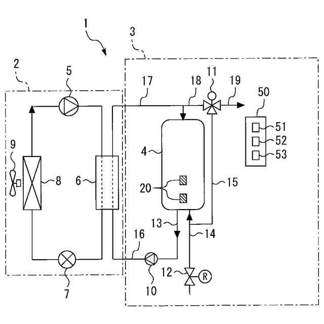 図1は、実施の形態1による貯湯式給湯機1を示す図である。図1に示すように、貯湯式給湯機1は、ヒートポンプサイクルを利用する加熱手段2と、貯湯タンク4を有する貯湯ユニット3とを備える。加熱手段2は、電力を消費して水を加熱する。加熱手段2は、屋外に設置される。貯湯ユニット3は、屋外に設置されてもよいし、屋内に設置されてもよい。