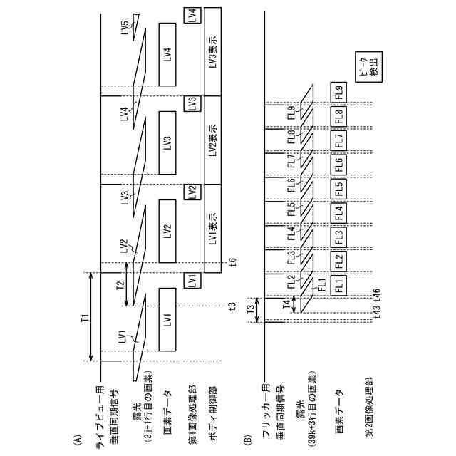 図4(A)は、ライブビュー画像を表示部に表示させるときのカメラの動作例を示すシーケンス図であり、図4(B)は、フリッカーを検出するときのカメラの動作例を示すシーケンス図である。