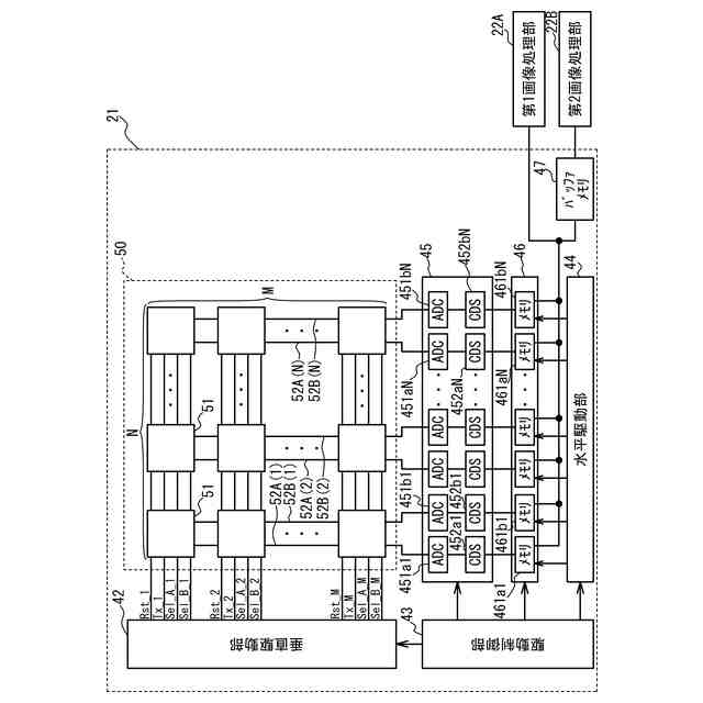 【解決手段】 撮像素子は、光学系を透過した光を光電変換して電荷を生成し、列方向に設けられる第1光電変換部と第2光電変換部と、前記第1光電変換部で生成された電荷に基づく第1の画像の生成に用いる第1信号が出力される第1信号線と、前記第2光電変換部で生成された電荷に基づいて、撮影状態の検出に用いる第2信号が出力される第2信号線と、前記第1信号に基づく第1データを出力する第1出力部と、前記第2信号に基づく第2データを出力する第2出力部と、を備える。