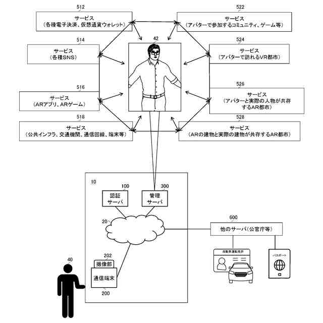 前記システムにおいて、前記認証要求取得部は、メタバース空間内に位置する前記アバターのデータを含む前記認証要求を取得してよく、前記認証部は、前記認証要求に含まれる前記アバターの複数の特徴点と、前記ユーザデータ記憶部に記憶されている前記ユーザデータに含まれる前記複数の特徴点とを比較することによって、前記メタバース空間内における前記ユーザの認証を行ってよい。前記認証部は、前記アバターが前記メタバース空間内に位置する間、定期的に又は不定期に前記アバターに対応する前記ユーザを認証し、認証に失敗した場合に、前記アバターによる前記メタバース空間の利用を禁止するよう制御してよい。
