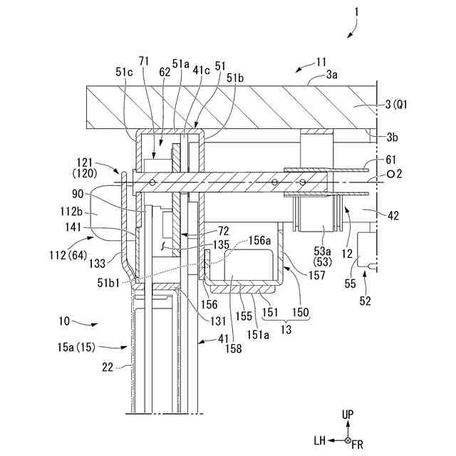 本態様によれば、当接部が枢支機構に対して左右方向の第1側にずれた位置に設けられているため、従来のように阻止ブロックが連接部の左右方向における寸法範囲内に設けられている場合に比べて、当接部の位置や形状について枢支機構の形状や位置への依存が少なくなる。その結果、設計自由度の向上を図ることができる。また、当接部が枢支機構に対して左右方向の第1側にずれた位置に設けられていることから、枢支機構周辺の機構を小型化することが可能になる。