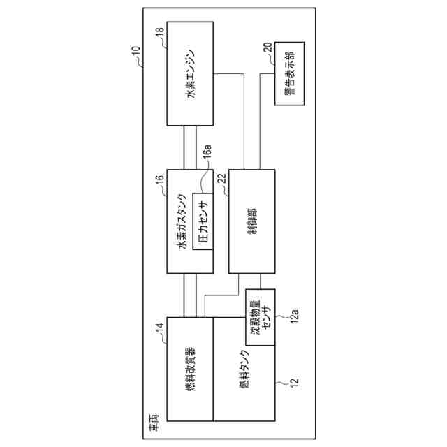図1に示すように、車両10は、燃料タンク12と、燃料改質器14と、水素ガスタンク16と、水素エンジン18と、警告表示部(表示部)20と、制御部22とを備える。