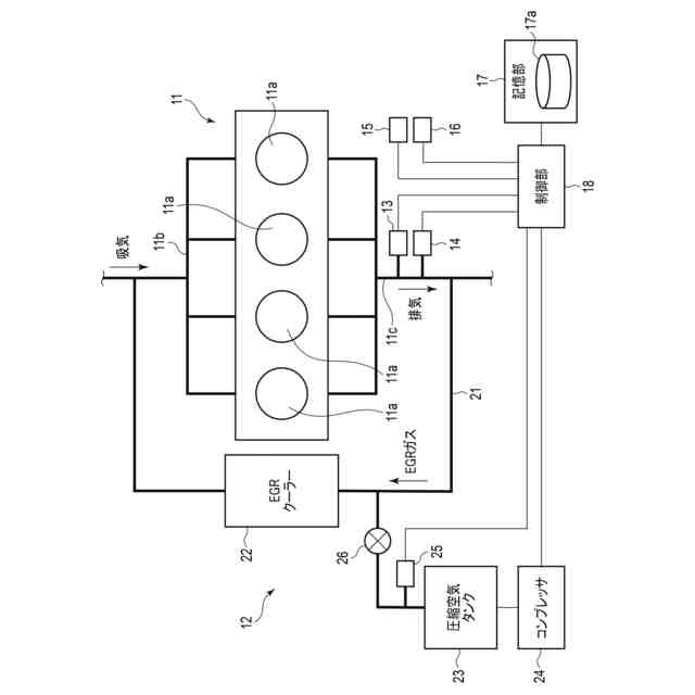 図1及び図2に示すように、車両1は、動力源として内燃機関11と、内燃機関11の排気を再循環するEGRシステム12と、を有する。なお、車両1は、内燃機関11に加えて、動力源として1以上のモータを搭載したハイブリット車(HEV:Hybrid Electric Vehicle)であってもよい。車両1は、例えばトラックである。車両1は、例えば、平ボディ車、ウイング車、幌付き車、ユニック車、車載車、タンクローリー車等である。なお、車両1は、トラックに限定されず、バス、乗用車、特殊用途自動車等であってもよい。