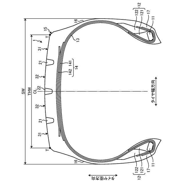同図において、タイヤ子午線方向の断面は、タイヤ回転軸(図示省略)を含む平面でタイヤを切断したときの断面として定義される。また、タイヤ赤道面CLは、JATMAに規定されたタイヤ断面幅の中点を通りタイヤ回転軸に垂直な平面として定義される。また、タイヤ幅方向は、タイヤ回転軸に平行な方向として定義され、タイヤ径方向は、タイヤ回転軸に垂直な方向として定義される。