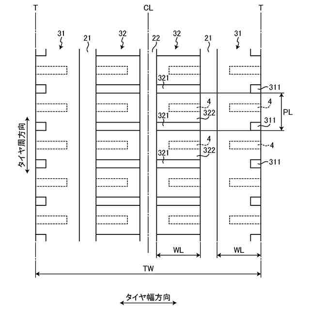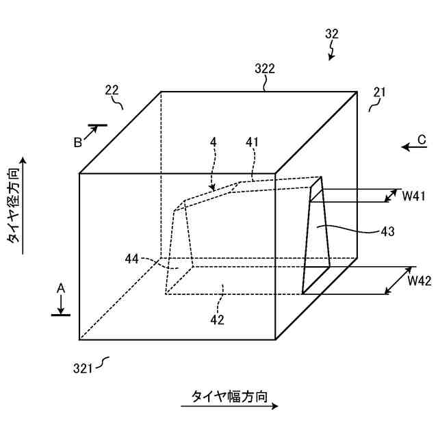 【解決手段】このタイヤ1では、陸部が、ブロック322の踏面に開口することなくタイヤ幅方向に延在して、一方の端部43にてブロック322のタイヤ幅方向外側の側面に開口すると共に他方の端部44にてブロック322の内部で終端する隠し溝4を備える。また、ブロック322の踏面側における隠し溝4の溝幅W41が、溝底42側における隠し溝4の溝幅W42に対してW41<W42の範囲にある。