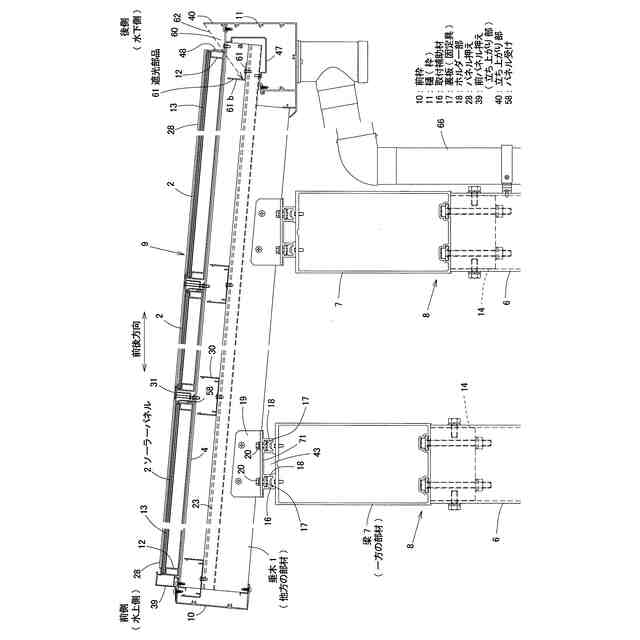 上記の課題を達成するために請求項1記載の発明による構造体は、垂木とソーラーパネルとを備え、垂木は、間隔をおいて複数設けてあり、ソーラーパネルの水下側端部を受けるパネル受けを有し、ソーラーパネルは、パネル受けを基準にして垂木間に架設してあり、垂木上に取付けられるパネル押えでソーラーパネルを垂木に固定してあることを特徴とする。