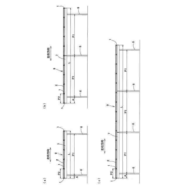 本発明の構造体のバリエーションを示す正面図であって、(a)は単体のもの、(b)は2連棟の場合、(c)は3連棟の場合を示す。