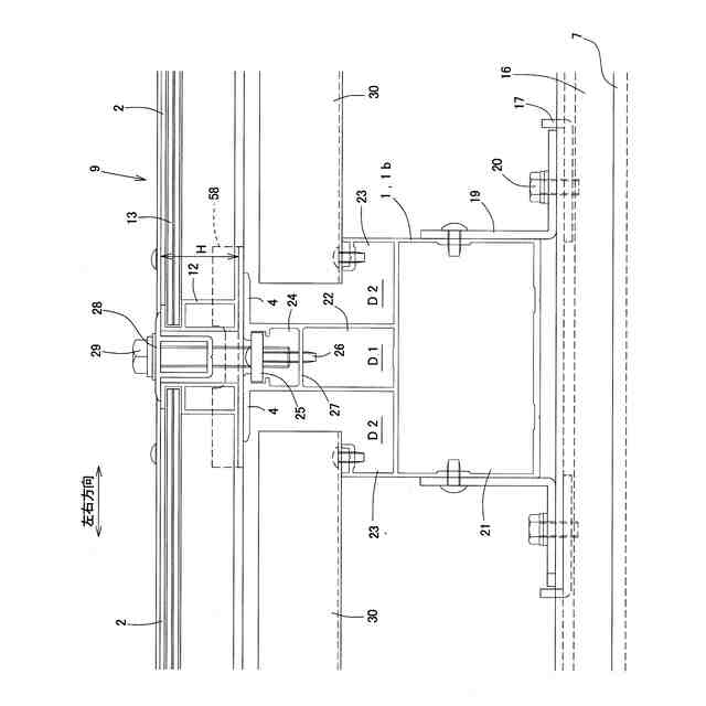 柱6は、略正方形断面のアルミ形材で形成してあり、下部を地面に埋め込んで周囲をモルタルで固めて垂直に立設してあり、柱6の上端は、図3に示すように、連結金具14を介して梁7の下面に固定してある。柱6の上端は、梁7の下面で梁7の長手方向の任意の位置に連結することができ、柱6は設置位置を左右方向に移動させることができる。