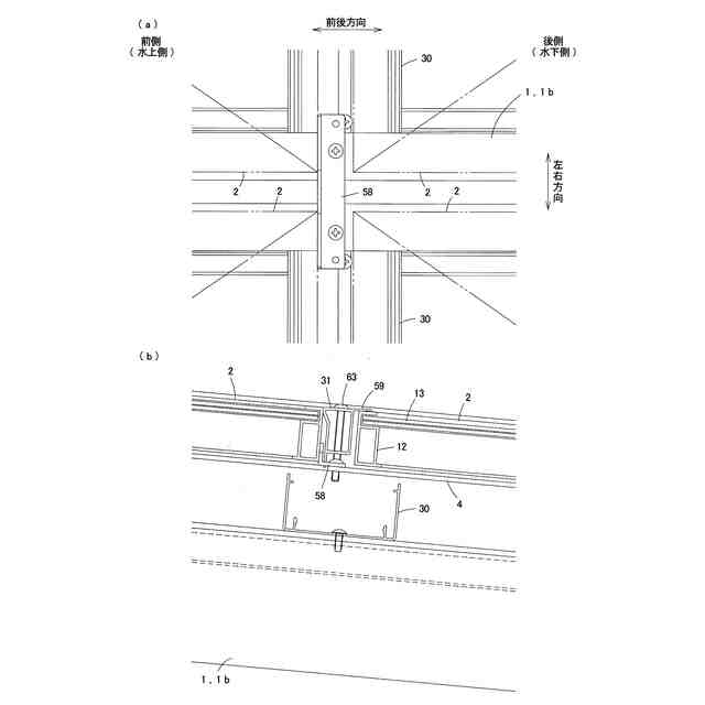 屋根9は、図1,2に示すように、前後方向に並ぶ2本の梁7上に複数の垂木1,1,…を左右方向に一定の間隔をおいて架設し、複数の垂木1,1,…の水上側端部に前枠10を架設し、複数の垂木1,1,…の水下側端部に樋(枠)11を架設し、各垂木1,1,…間にソーラーパネル2を架設して構成してある。ソーラーパネル2は、左右方向に5枚、前後方向に3枚並べて取付けてある。ソーラーパネル2は、図3,4に示すように、矩形に組んだフレーム12と、フレーム12の内側に保持した太陽電池パネル13とを有している。