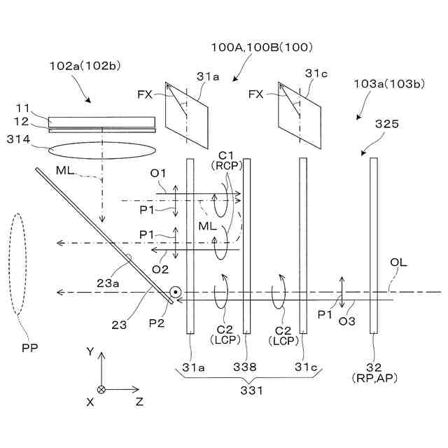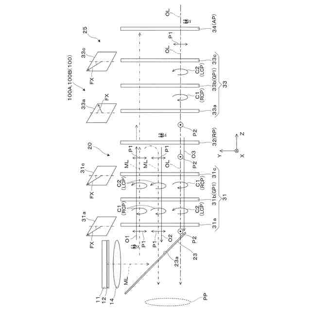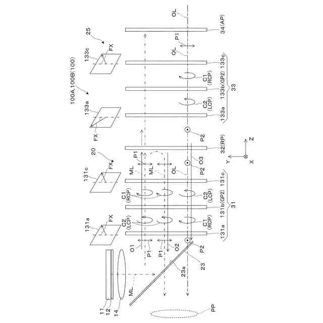 前記反射光学素子は、透過型ミラーからの順で、第1偏光回折レンズを含み偏光方向の切替えによってパワーの正負を反転させ偏光方向を維持する第1レンズ機能部材と、前記第1偏光方向の直線偏光を偏光方向を維持しつつ反射する第1光学素子と、第2偏光回折レンズを含み偏光方向の切替えによってパワーの正負を反転させ偏光方向を回転させる第2レンズ機能部材と、前記第1偏光方向の直線偏光を選択的に透過させる第2光学素子とを有する、