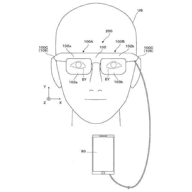 HMD200は、右眼用の第1虚像表示装置100Aと、左眼用の第2虚像表示装置100Bと、虚像表示装置100A,100Bを支持する一対のテンプル100Cと、情報端末であるユーザー端末90とを備える。第1虚像表示装置100Aは、上部に配置される第1表示駆動部102aと、眼前を覆う第1表示光学系103aとで構成される。第2虚像表示装置100Bは、上部に配置される第2表示駆動部102bと、眼前を覆う第2表示光学系103bとで構成される。第1虚像表示装置100Aと、第2虚像表示装置100Bとを組み合わせたHMD200は、広義の虚像表示装置でもある。一対のテンプル100Cは、装着者USの頭部に装着される装着部材又は支持装置106であり、外観上一体化されている表示駆動部102a,102bを介して一対の表示光学系103a,103bの上端側を支持している。一対の表示駆動部102a,102bを組み合わせたものを駆動装置102と呼ぶ。