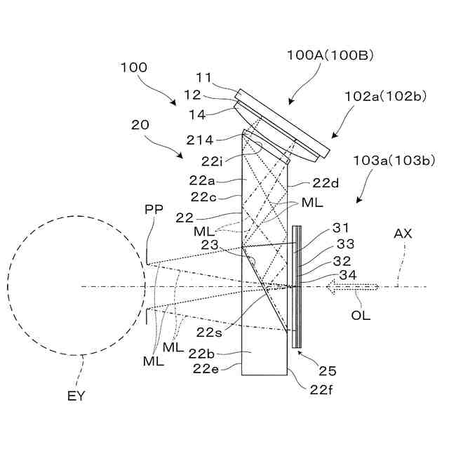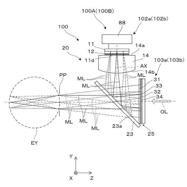 図2は、第1表示駆動部102aと第1表示光学系103aとに組み込まれた結像系等の構造を説明する側面図である。第1表示駆動部102aは、表示器11と、偏光フィルター12と、レンズ14と、表示制御装置88とを備える。第1表示光学系103aは、表示器11からの映像光MLを反射によって偏向する透過型ミラー23と、透過型ミラー23で反射された映像光MLを逆進させる際に正のパワーを持つミラーのように作用する反射光学素子25とを備える。これらのうち、レンズ14と、透過型ミラー23と、反射光学素子25とを組み合わせたものを結像光学系20と呼ぶ。