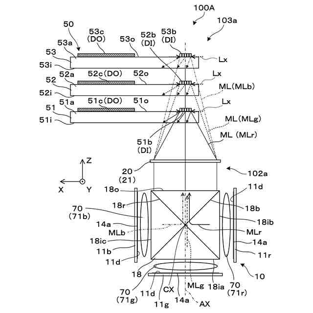 前記クロスダイクロイックプリズムと、前記第1表示パネル、前記第2表示パネル、及び前記第3表示パネルとの間に光学レンズを有する、