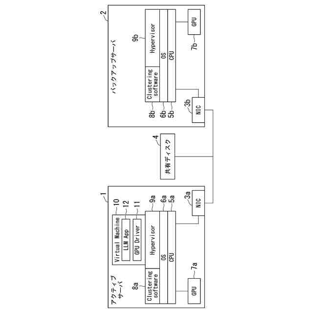 システムを安定化し、復旧時間を短縮する従来技術としてクラスタリングソフトウェアによるVirtual Machine(仮想マシン)のマイグレーションが挙げられる。クラスタリングソフトウェアとは、1台のアクティブサーバ、1台以上のバックアップサーバで構成されるクラスタ構成を制御するソフトウェアである。図1にシステム構成例を示す。図1の例では、アクティブサーバ1とバックアップサーバ2が、Network Interface Card(NICと称する)3a、3bを介して、共有ディスク4に接続されている。アクティブサーバ1には、CPU5aおよびGPU7aが搭載されている。CPU5aでは、OS6aが稼働し、OS6aにはクラスタリングソフトウェア8aと仮想マシンを作成・実行するソフトウェアであるHypervisor(ハイパーバイザー)9aが実装されている。バックアップサーバ2についても同様に、CPU5bおよびGPU7bが搭載され、CPU5bではOS6bが稼働し、OS6bにはクラスタリングソフトウェア8bとHypervisor9bが実装されている。また、アクティブサーバ1にはHypervisor9aにVirtual Machine10が構築されており、Virtual Machine10には、GPU7aの初期化プロセスを実行するGPU Driver11や大規模学習を実行するためのLLMのApplication12が実装されている。