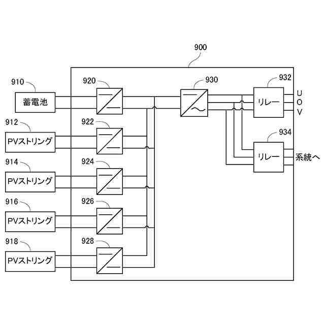 PVストリング912からPVストリング918により発電された直流電力は、DC/DC変換器922からDC/DC変換器928により昇圧されてDC/AC変換器930に入力され、DC/AC変換器930により交流電力に変換されてリレー932およびリレー934を介して出力される。リレー932からは、単相三線の交流電力が、蓄電システム900が設置された家屋の分電盤(図示せず)を介して負荷に供給される。リレー934は系統に接続されており、PVストリング912からPVストリング918の発電電力は、系統に出力される(以下、売電という)。