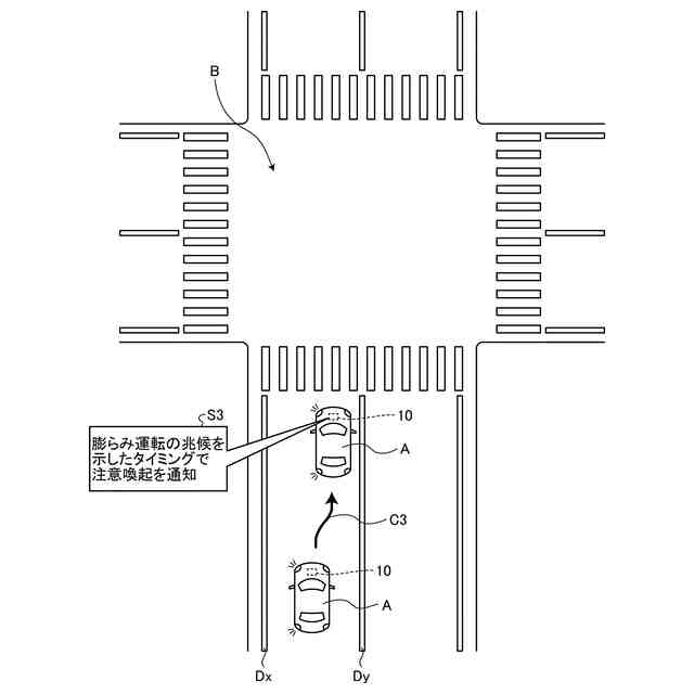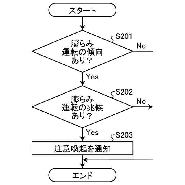 車両の右左折時に車両が右左折方向とは反対側に一旦膨らんでから右左折する膨らみ運転は、周辺の他車両の走行に影響を与え危険である。そこで、従来、膨らみ運転を検知した場合に、注意喚起を通知する技術が提案されている(例えば、特許文献1参照)。