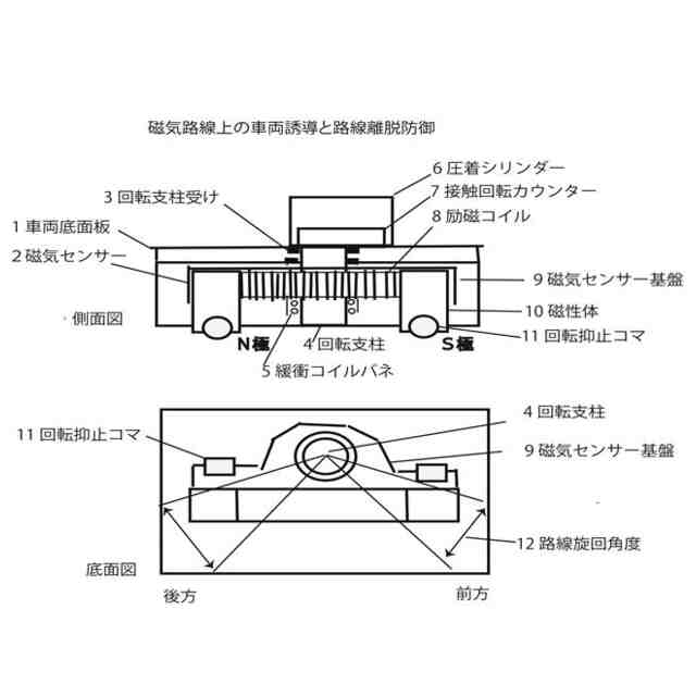 車両底面板1の上部の回転支柱4には、磁気センサー2からの方位情報を受ける接触回転カウンター7を配置し、磁気センサー2の方位情報を取得する。更に回転支柱の最上部には圧着シリンダー6を取り付けた、圧着シリンダー6による磁気センサー2の上下操作を実行する。回転支柱4に設置された磁気センサー2は、車両下部左右に磁気路線に面して車両の前後方向に0点を合わせて取り付ける。圧着シリンダー6で回転支柱4を上下し、通常運行時は磁気センサー2を路面から離して保持し、弱い磁気により路線方位の監視センサーとして作働し、高速走行時、又は路線の湾曲部では励磁電流を増大し、車両の磁気路線離脱を防ぐ。