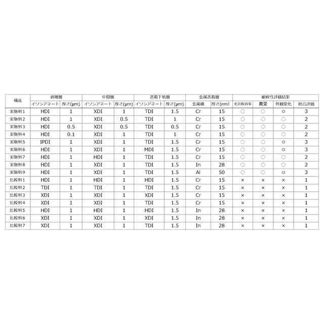 具体的には、従来公知の金属蒸着層を有する転写フイルムを用いた積層体は、紫外線を吸収しやすい樹脂(例えば、芳香環を有するイソシアネートを使用した反応硬化物)からなる層のみを積層体表面側(金属蒸着層上)に設けた場合、該樹脂層を構成する樹脂が、紫外線のエネルギーを吸収し、酸化され、キノン構造を形成し、該樹脂層、ひいては積層体全体が黄変したように見える場合があるという問題点が存在した。逆に、積層体表面側(金属蒸着層上)に紫外線を吸収しにくい樹脂(例えば、芳香環を有しないイソシアネートを使用した反応硬化物)からなる層のみを設けた場合、金属蒸着層に不可避的に存在するピンホールと呼ばれる蒸着欠陥、あるいは金属蒸着層の海島構造の海部分の金属蒸着層の存在しない部分を、紫外線が透過し、該紫外線により、接着層や被加飾基材が劣化する。結果、金属光沢の劣化、外観変化が発生するという問題点が存在した。また、脂環式あるいは脂肪族イソシアネートを使用した反応硬化物からなる層は耐熱性が悪くなる場合があり、金属蒸着層の形成時に所望の金属光沢が得にくい場合があった。