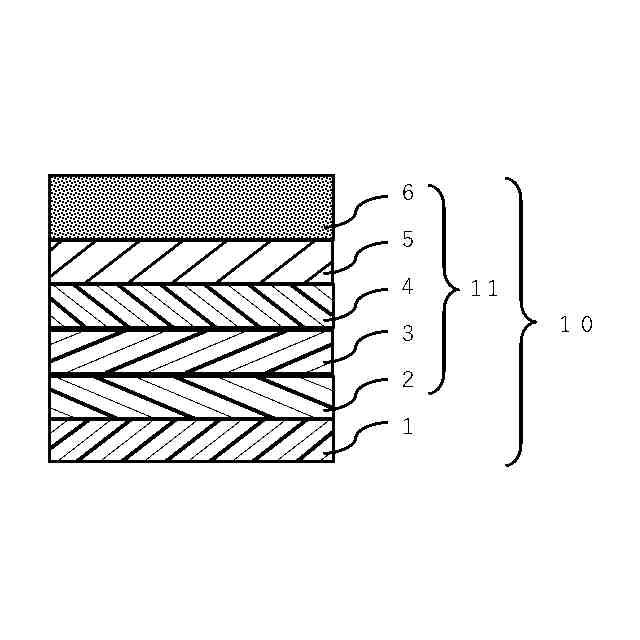 本発明の一実施形態に係る転写フイルムの層構成の一例を示す図であり、離型性基材1上に、剥離層2、中間層3、蒸着下地層4、金属蒸着層5、接着層6がこの順で形成されている。