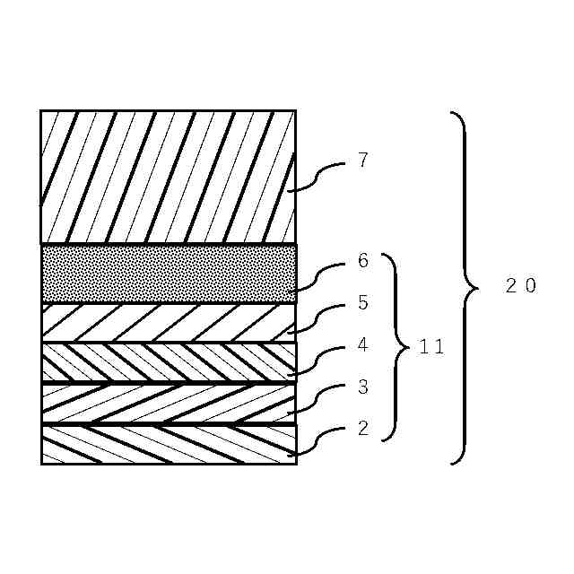 図1の本発明の転写フイルムを使用して得られた本発明の積層体の層構成の一例を示す図であり、被加飾基材7の表面には、接着層6、金属蒸着層5、蒸着下地層4、中間層3、剥離層2がこの順で形成されている。