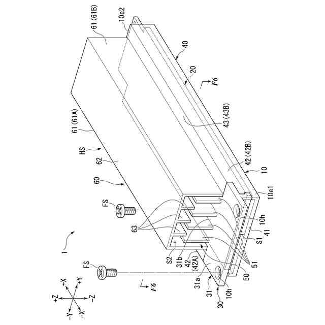 本出願では、+X方向、-X方向、+Y方向、-Y方向、+Z方向、および-Z方向は、以下のように定義される。+X方向、-X方向、+Y方向、および-Y方向は、後述する基板21の第1面21aと平行な方向である(図2参照)。+X方向は、筐体10の第1端部10e1から第2端部10e2に向かう方向である(図1参照)。-X方向は、+X方向とは反対の方向である。+X方向と-X方向とを区別しない場合は、単に「X方向」と称する。+Y方向および-Y方向は、X方向とは交差する(例えば直交する)方向である。+Y方向は、後述する筐体10の一方の側壁(第3壁42A)から他方の側壁(第3壁42B)に向かう方向である(図1参照)。-Y方向は、+Y方向とは反対の方向である。+Y方向と-Y方向とを区別しない場合は、単に「Y方向」と称する。+Z方向および-Z方向は、X方向およびY方向とは交差する(例えば直交する)方向である。+Z方向は、後述する筐体10の第2壁41から第1壁31に向かう方向である(図1参照)。-Z方向は、+Z方向とは反対の方向である。+Z方向と-Z方向とを区別しない場合は、単に「Z方向」と称する。Z方向は、基板21の厚さ方向である。Z方向は、「第1方向」の一例である。+Z方向側は、「第1側」の一例である。-Z方向側は、「第2側」の一例である。Y方向は、「第2方向」の一例である。