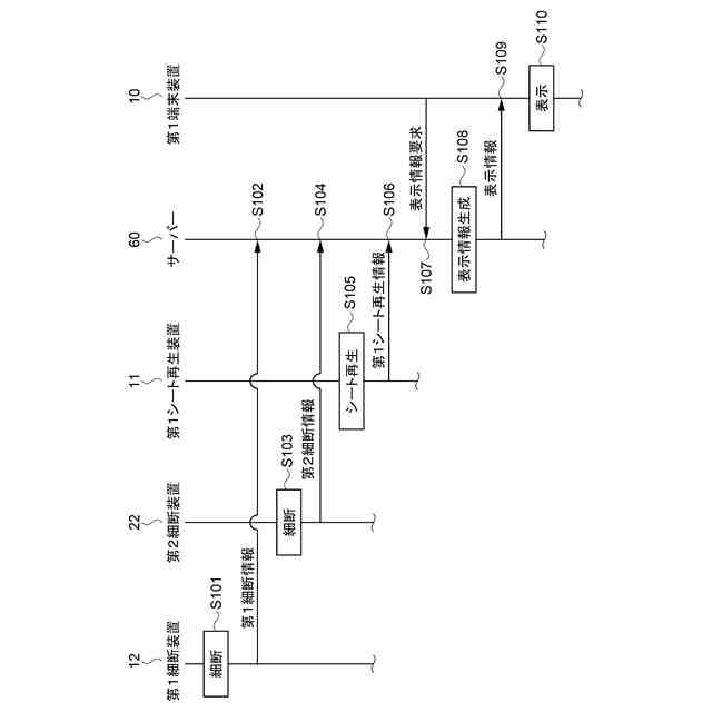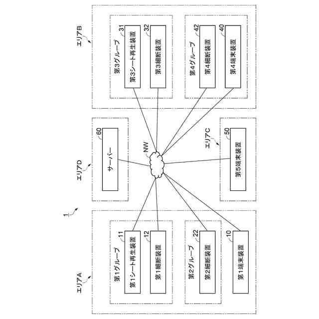 図1に示すように、実施形態に係るシート再生システム1は、第1シート再生装置11、第1細断装置12、第2細断装置22、第1端末装置10、第3シート再生装置31、第3細断装置32、第4細断装置42、第4端末装置40、第5端末装置50、サーバー60を含んで構成される。