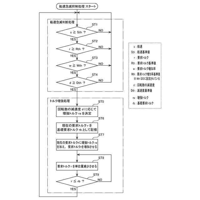 船舶が航走しているとき、船舶が波に乗り上げて水面から上方へジャンプすることがある。ジャンプした船舶が着水したとき、船舶の船体の喫水線の位置が上昇し、船体、または船舶推進機のプロペラに加わる水の抵抗が急増する。その結果、船速が急に大きく減少する。また、航走中の船舶が高い波に正面からぶつかり、船首の喫水線の位置が上昇したときなどにも、船速が急に大きく減少する。船速が急に大きく減少すると、前方に押されるような大きな力が操船者または同乗者に加わり、航行の快適性が損なわれる。そこで、航走中における船舶の着水や、船舶と波との衝突などにより船速が急減したときに、船速の減少量を小さくし、前方に押されるような大きな力が操船者または同乗者に加わることを抑制し、航行の快適性を高めることが望まれる。
