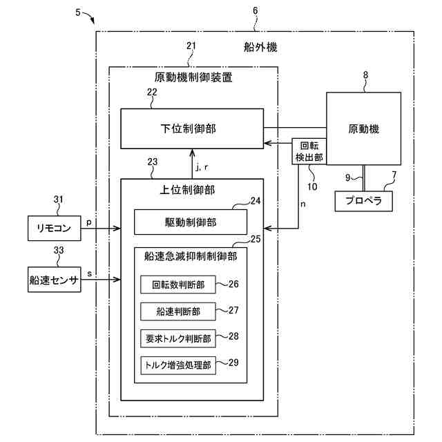 船舶推進機により生成される推進力は、船舶推進機が有する原動機が発する駆動トルク(回転トルク)が大きいほど大きくなる。操作装置と原動機との間には、操作レバーの操作量に応じて原動機が発する駆動トルクを増減させる制御を行う原動機制御装置が設けられている。