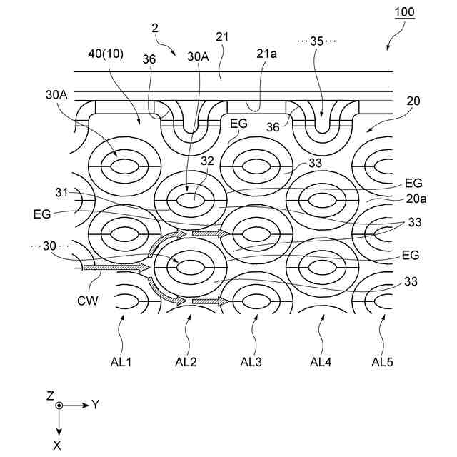 複数の前記第1の突出部は、前記第1の方向、及び前記冷却流体が流れる第2の方向と交差する第3の方向に並ぶように配列され、当該配列が前記第2の方向に複数列設けられ、