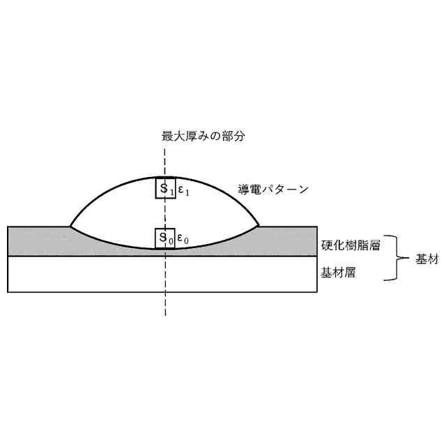 前記導電パターンの断面内の、当該導電パターンの厚みが最大の部分において、前記基材にできるだけ近いところに8μm四方の正方形領域S