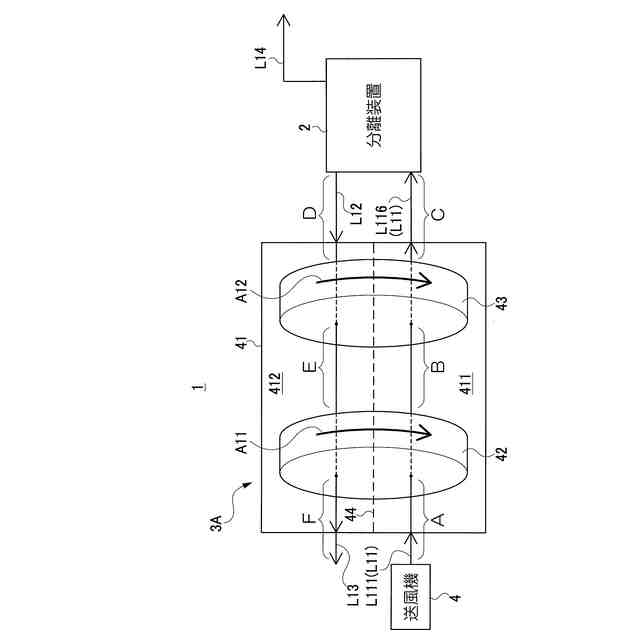 前記除湿装置は、前記第2供給ラインから供給される前記分離後ガスにより、前記除湿剤の再生を行うこと、
